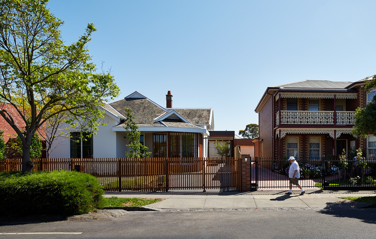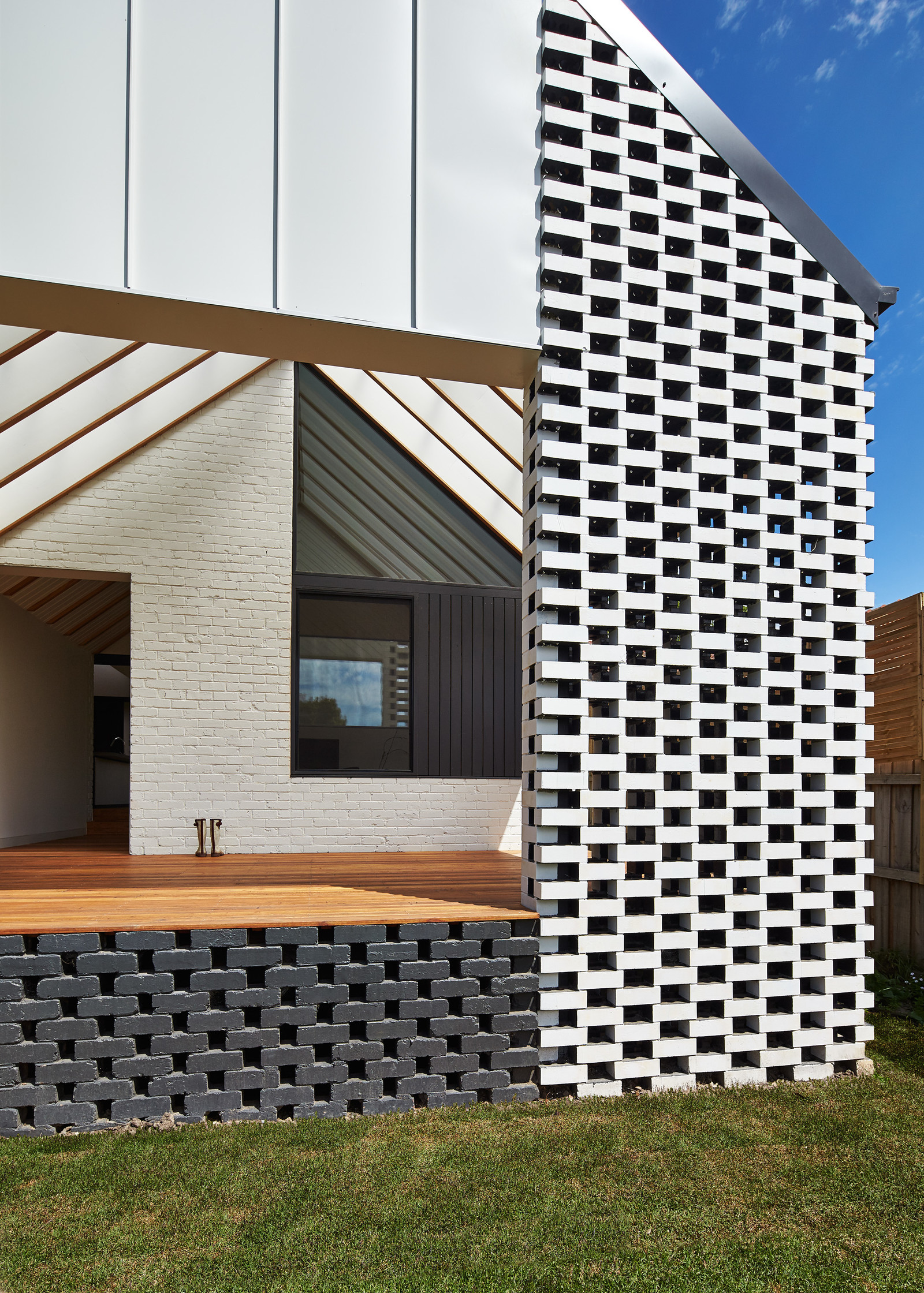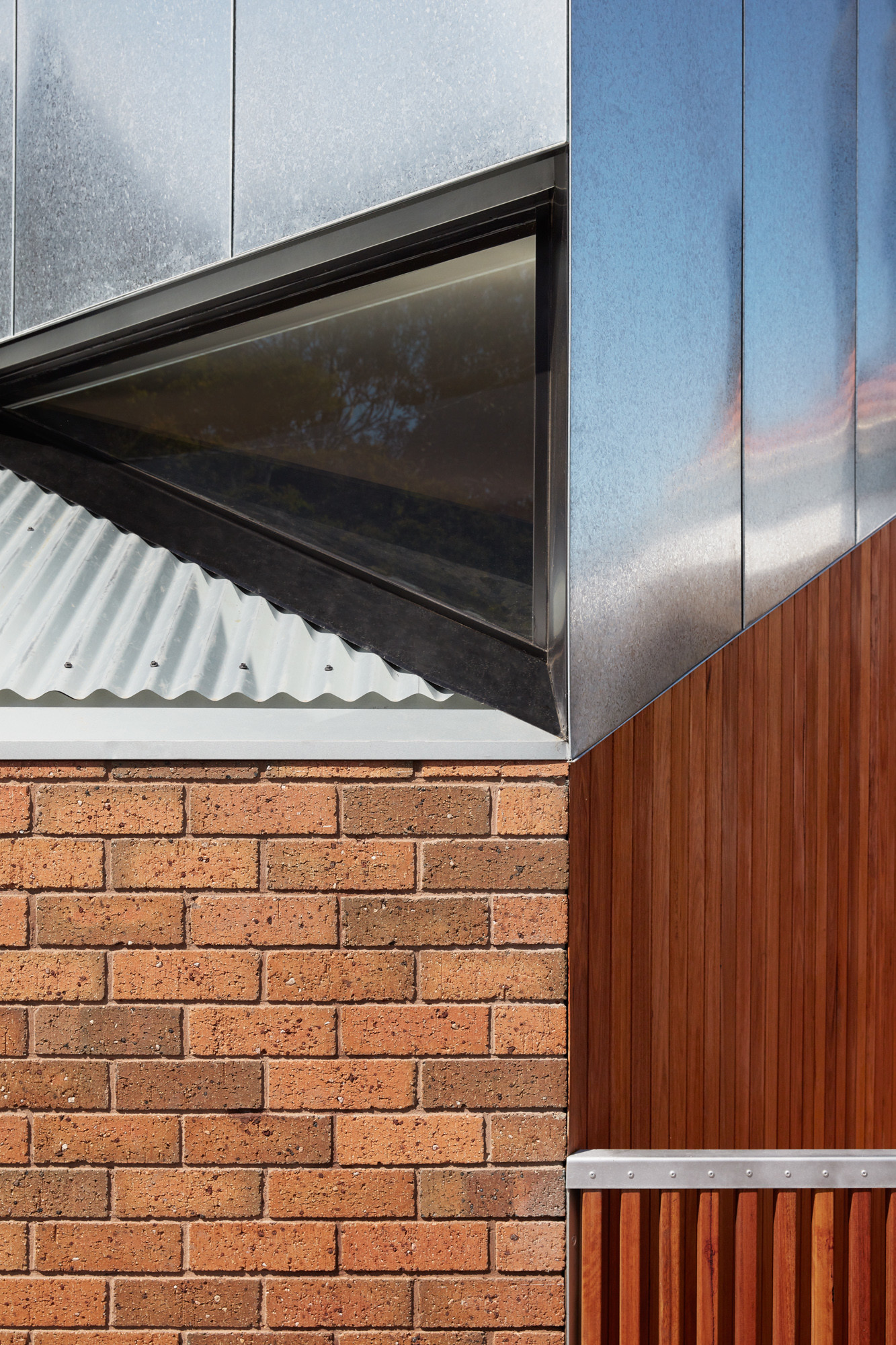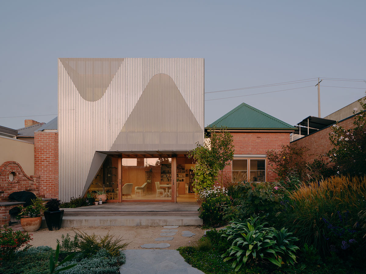 This project demonstrates the power of a geometric aberration. Located in Warracknabeal, the birthplace of Nick Cave, the original house was designed by Peter Staughton, later extended by his sons Stephen and James. Where the work of the two generations meet, their geometries find a moment of distinct discomfort. Rather than seeking harmonious resolution, brothers Staughton lean-in, brutally highlighting the disjunct with a coat of retro-reflective film to catch the headlights of passing cars.