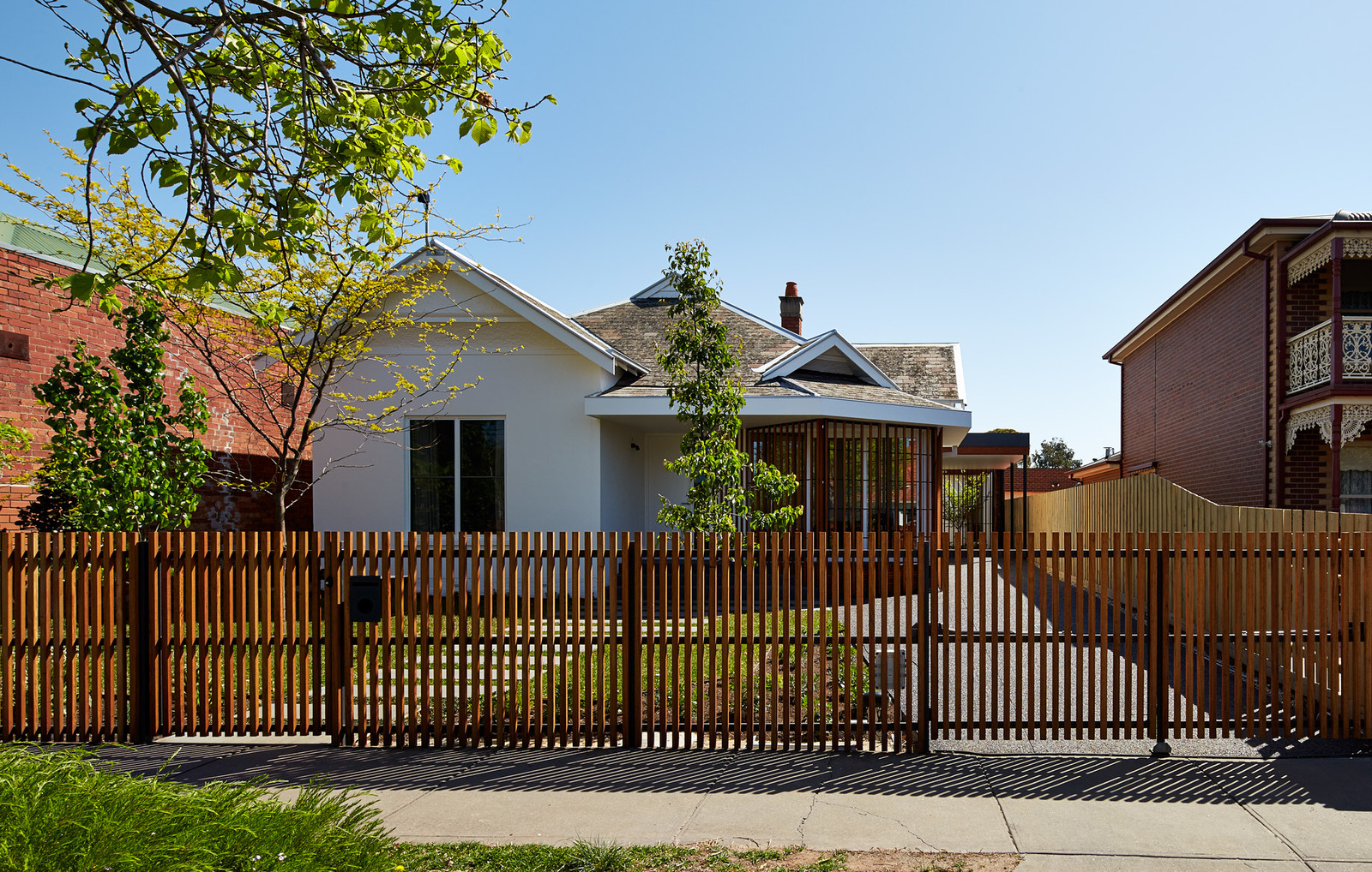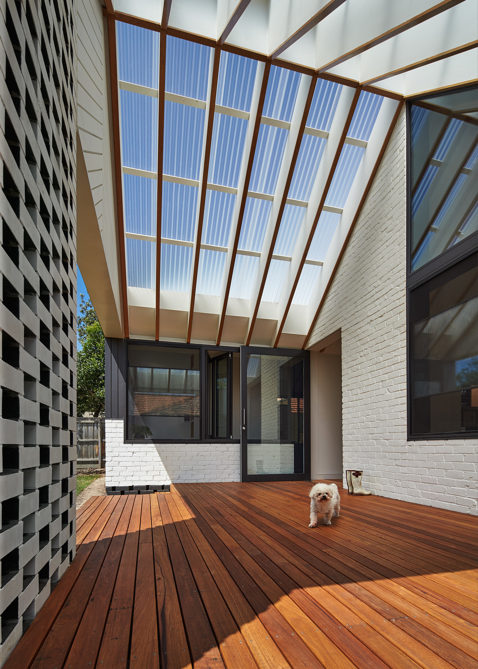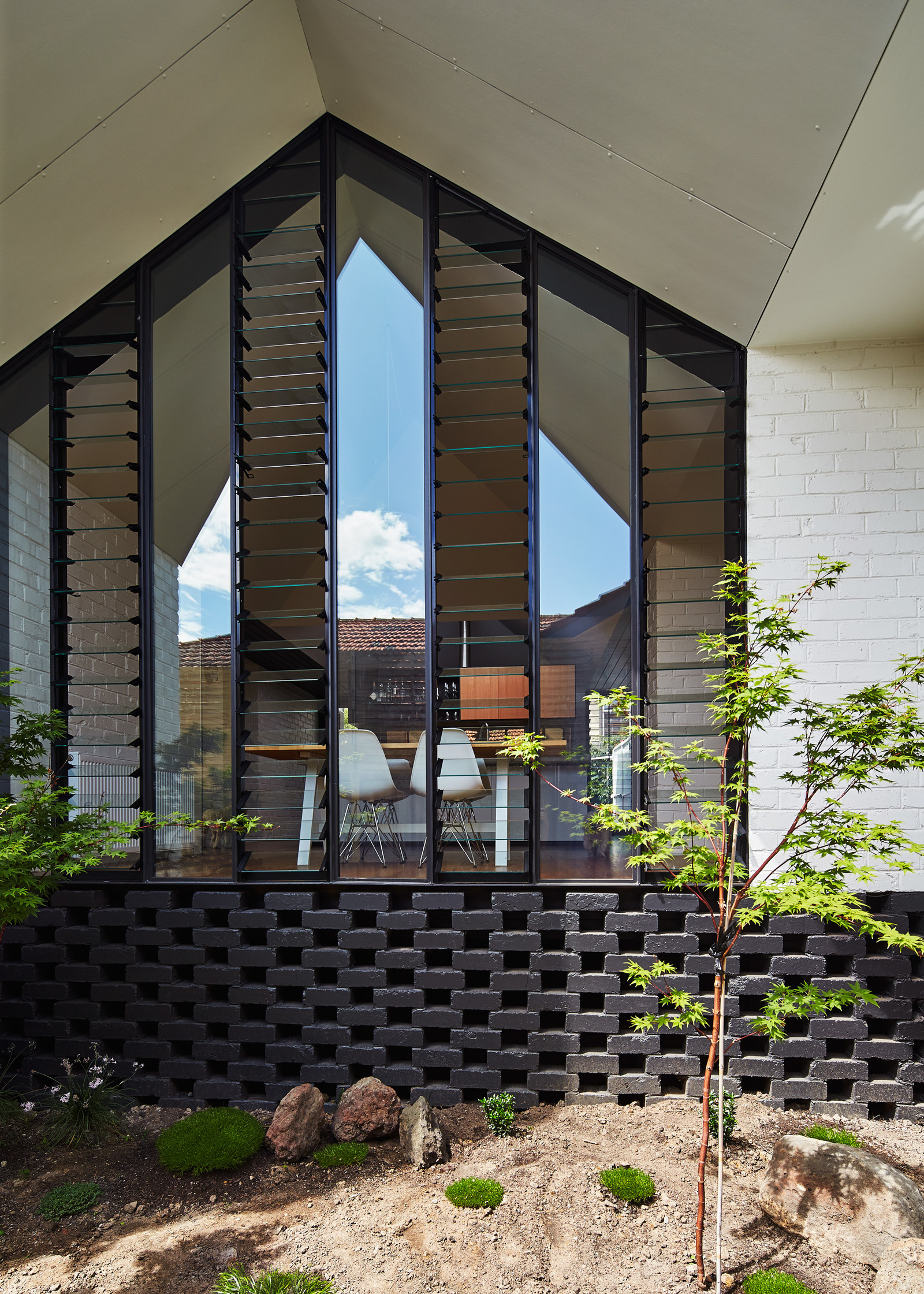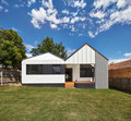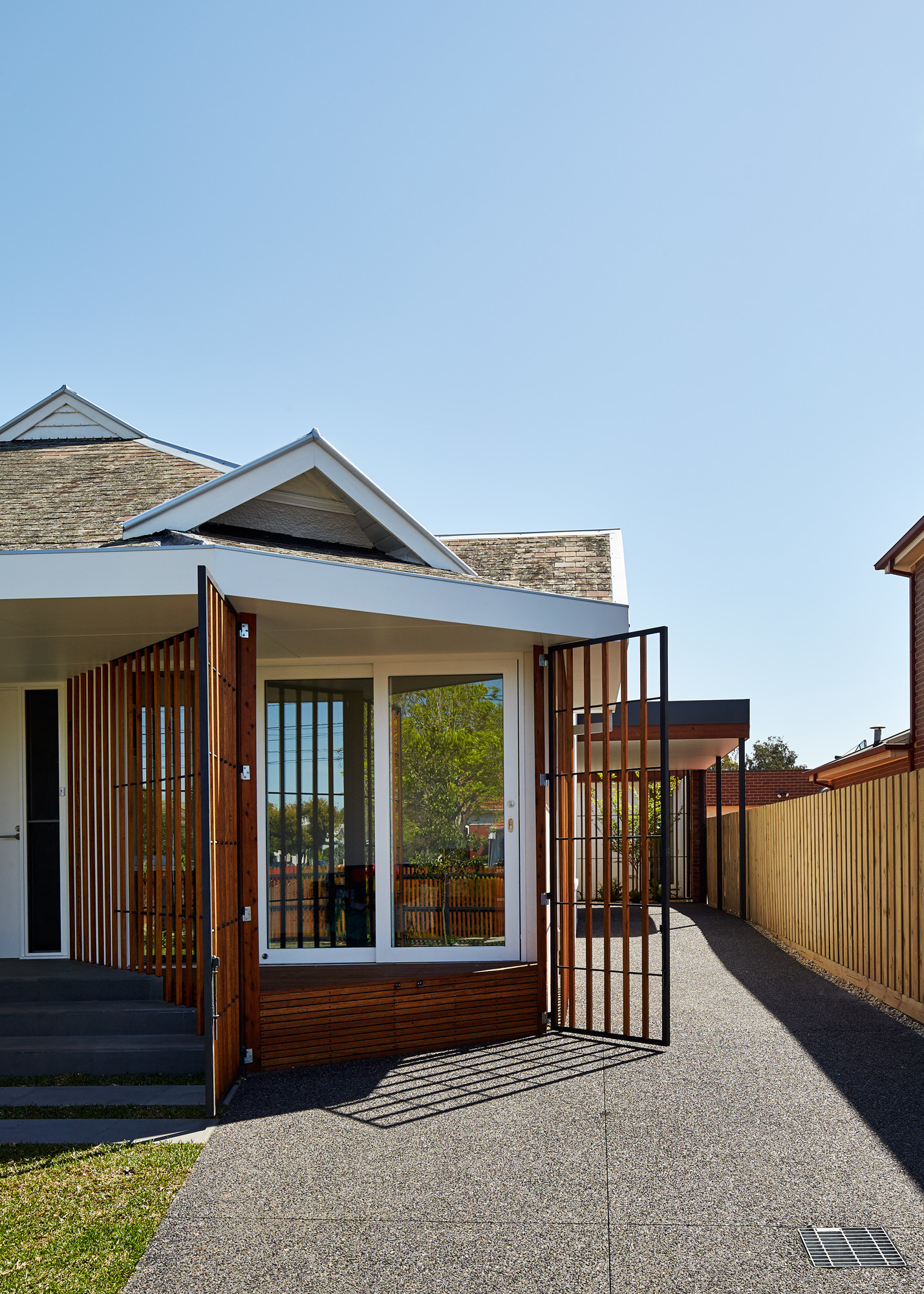 This project demonstrates the power of a geometric aberration. Located in Warracknabeal, the birthplace of Nick Cave, the original house was designed by Peter Staughton, later extended by his sons Stephen and James. Where the work of the two generations meet, their geometries find a moment of distinct discomfort. Rather than seeking harmonious resolution, brothers Staughton lean-in, brutally highlighting the disjunct with a coat of retro-reflective film to catch the headlights of passing cars.