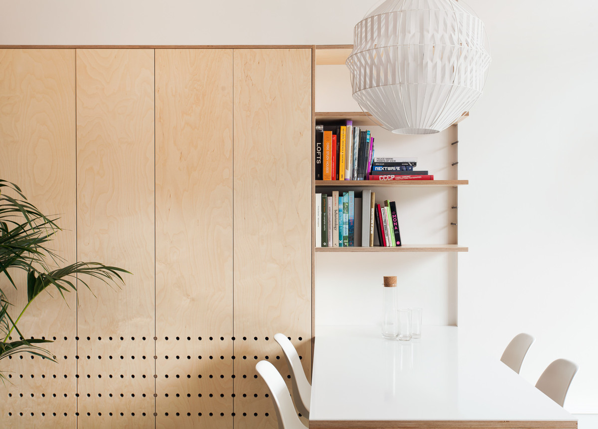 The interior palette was light and simple, with modest flourishes of detail where bookshelves terminate and cupboard doors open see internal elevations. 4m high windows looked out onto the eucalypts of Atherton Gardens and flooded the space with abundant natural light. A minor jungle of indoor plants ensured the air was ever sweet and doors at each end of the space provided a cooling breeze for those balmy summer days.