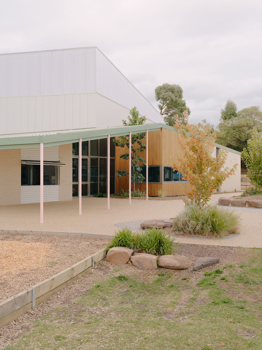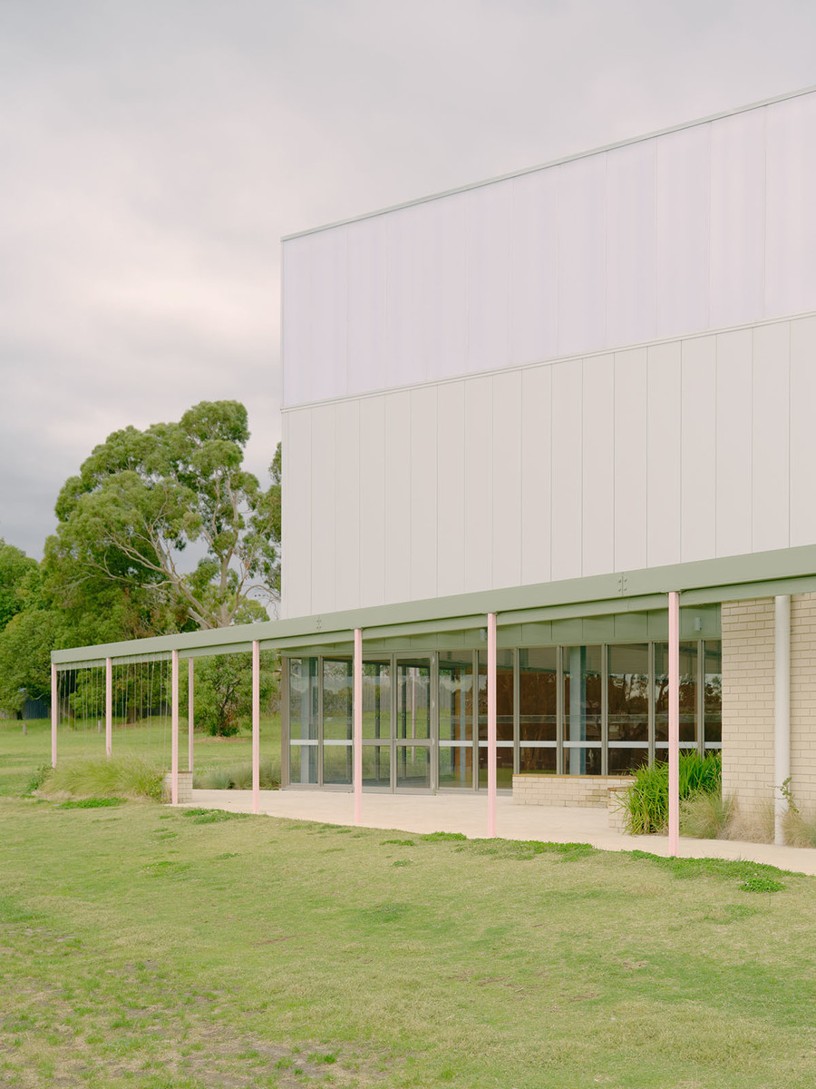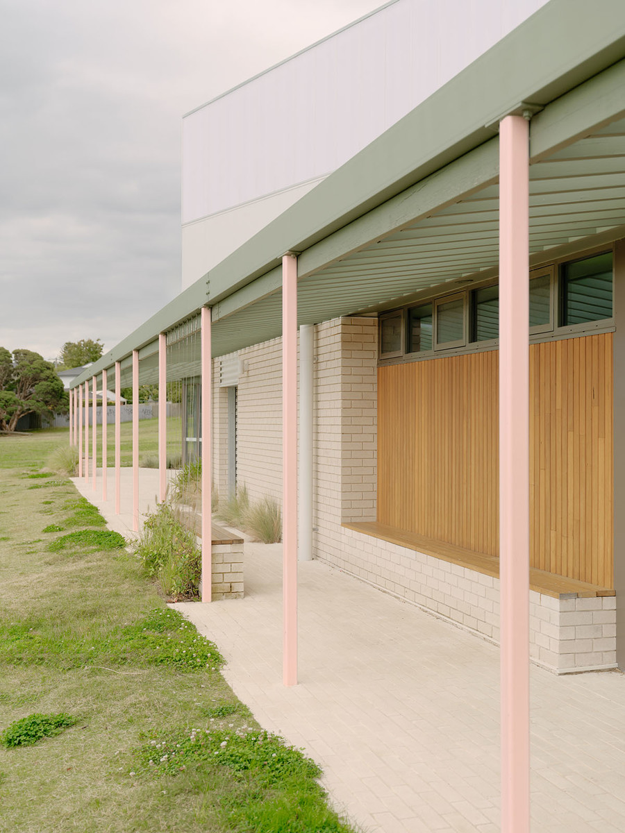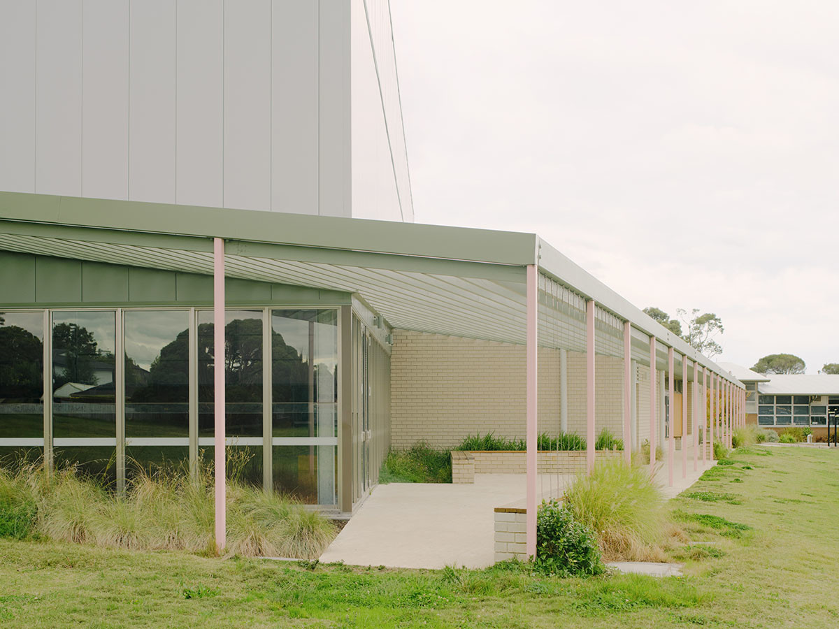 Externally, the building is anchored by an earthy base of ivory brick and warm timbers. The heft of the gymnasium is further grounded by a eucalypt-green veranda, perched on a colonnade of pink columns: a shady arbour reminiscent of a flowering gum. Here, alcoves provide informal seating for groups and individuals, while deciduous climbers trained on tension wires provide shade and screening.