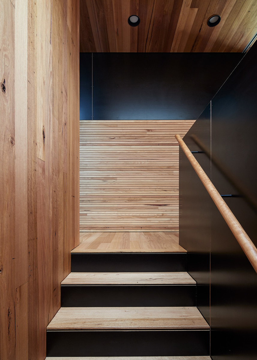 In the corridors where space is tighter, the palette lightens and the ceilings lift. The corridor walls - slim and prefabricated to maximise internal space – are lined with metal sheet to reflect light deep into the house.