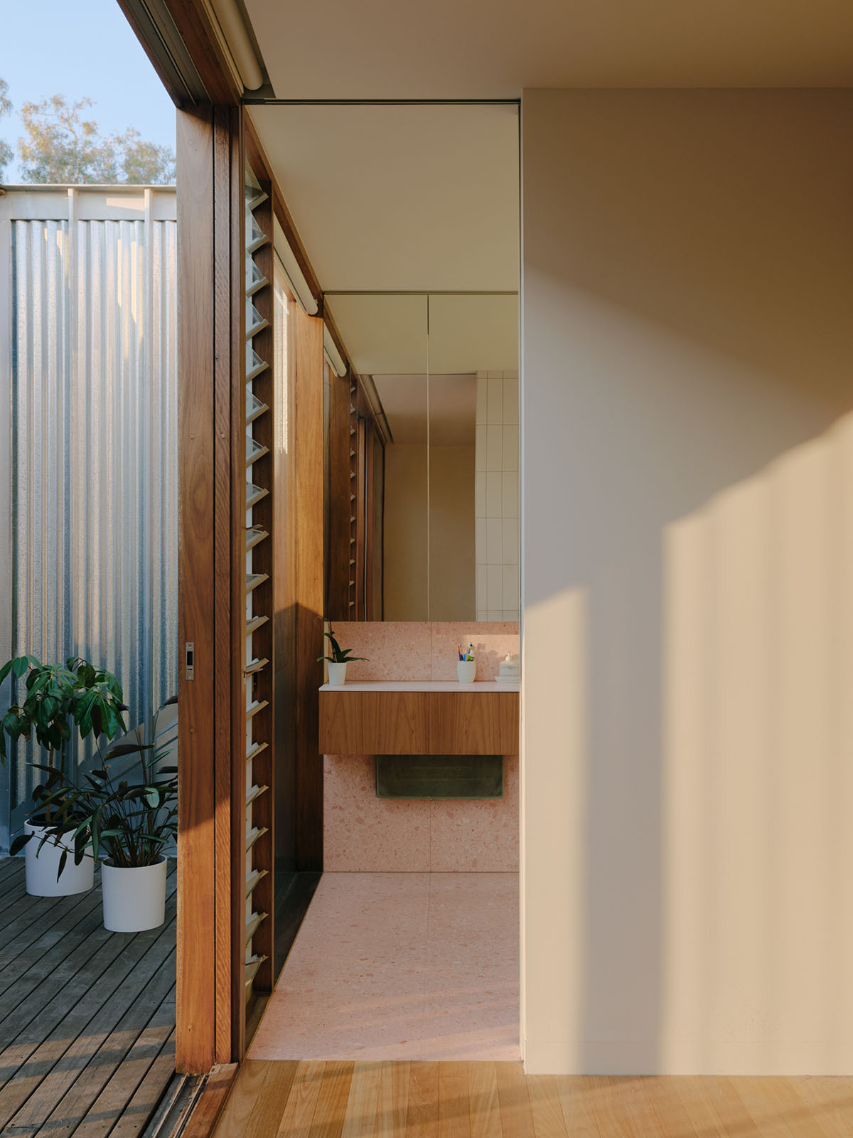Later, as the gathering thins, Frances climbs the staircase. At the landing she lingers, her gaze framed by treetops and skyline. Upstairs the bedroom feels like retreat: a room for breath and quiet. She looks to the Shot Tower: a metronome for thought in perfect stillness. She opens the louvres and the scented night folds in.