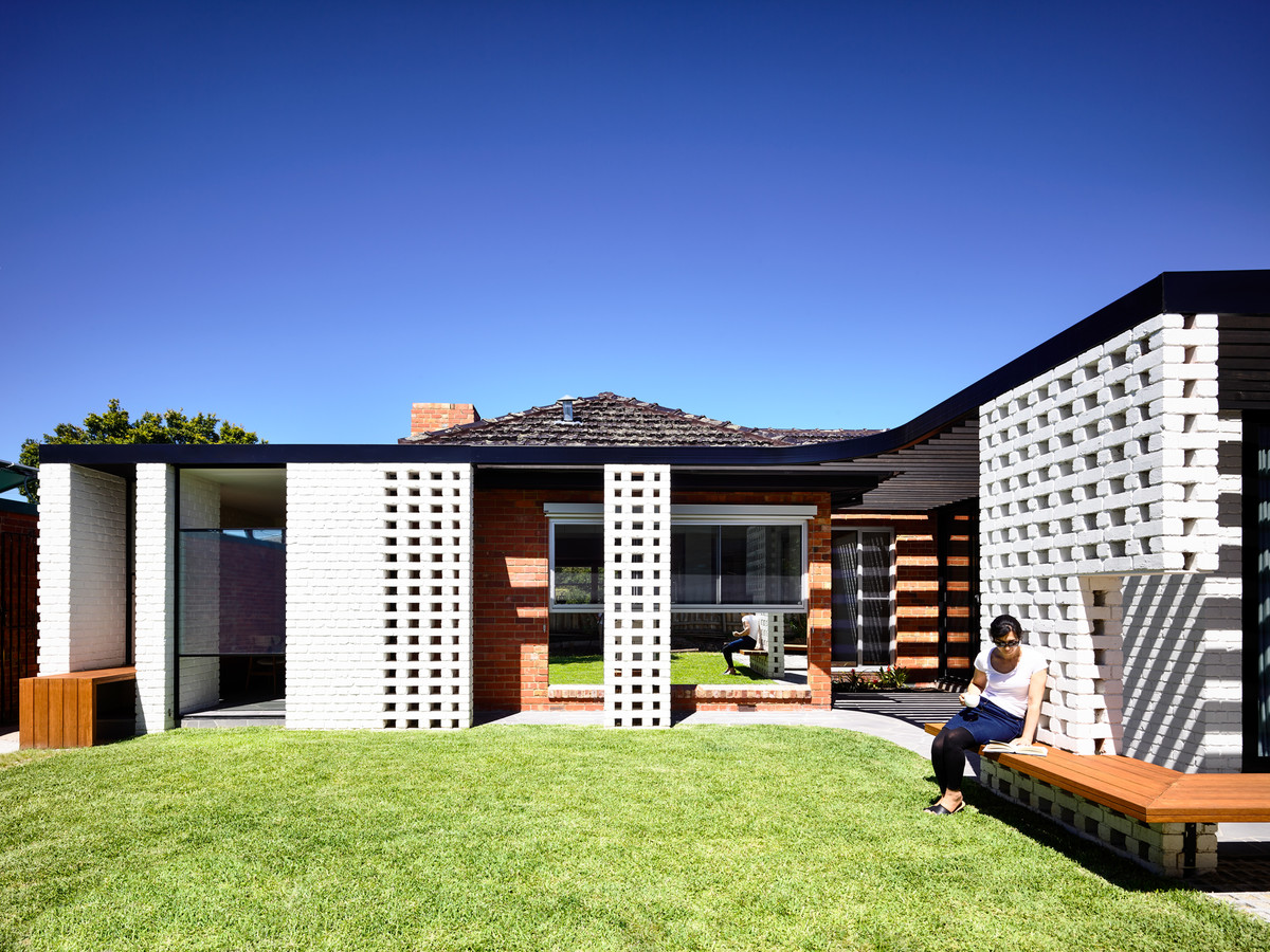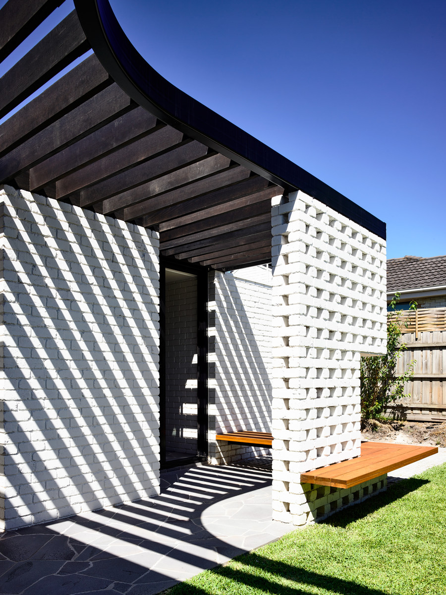 To the rear, the extension appears as a neutral field of white blade walls supporting a thin, flat roof. The original roofline remains visible and the red brick house is merely veiled, appearing almost as if untouched. These new white walls create deep, shady thresholds for outdoor seating, dining and reclining, while concealing new bedrooms and new living quarters in their protective shade. (see Fragment 1) and (Fragment 5)