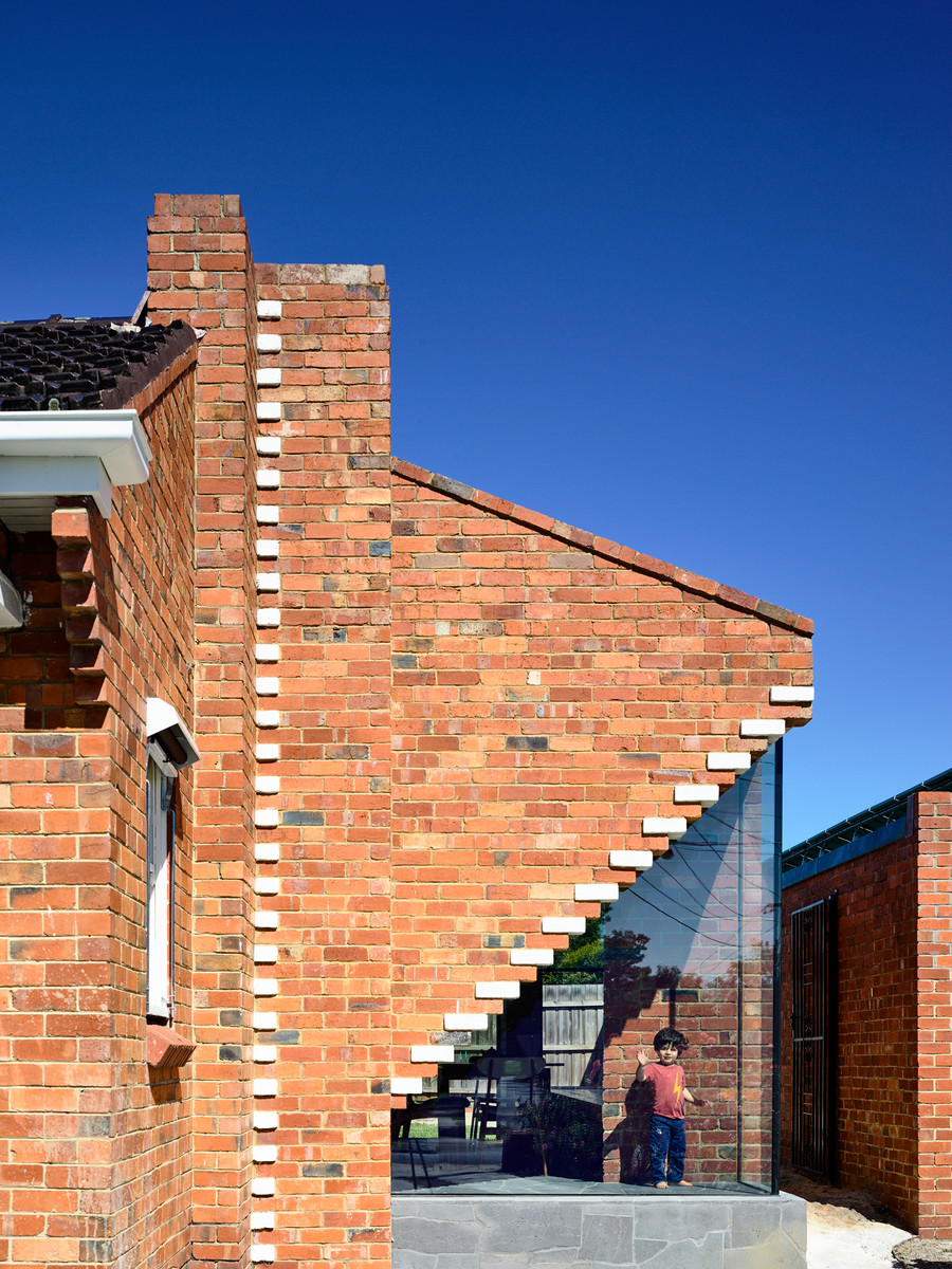 The side extension, visible from the street, somewhat mirrors the original house. For clarity, the mirror line is marked by a vertical zip of projecting white bricks. Either side of this line is the chimney, in true facsimile. Thereafter things get distorted as the stepped corbel brickwork is magnified through the architectural looking glass.