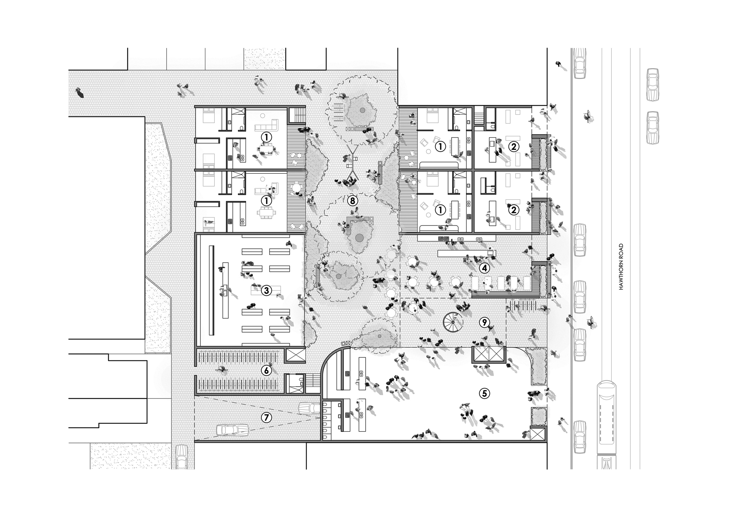 The life of any building begins at the ground level. Street facing shopfronts draw visitors from the Glenhuntly Road retail village. The site entrance is flanked by the bustling activity of a community centre and a café, spilling out into the public space see detailed plan. The charm of a bookshop, visible from the street, draws people further into the site, where they also find a protected urban garden and play equipment for the kids. Apartments either side of the courtyard lend a sense of intimacy and ensure that this community gathering place feels safe and visible throughout the day, encouraging pedestrians to use the site as a lively, social thoroughfare; a gateway to the diverse community offerings in the buildings above.