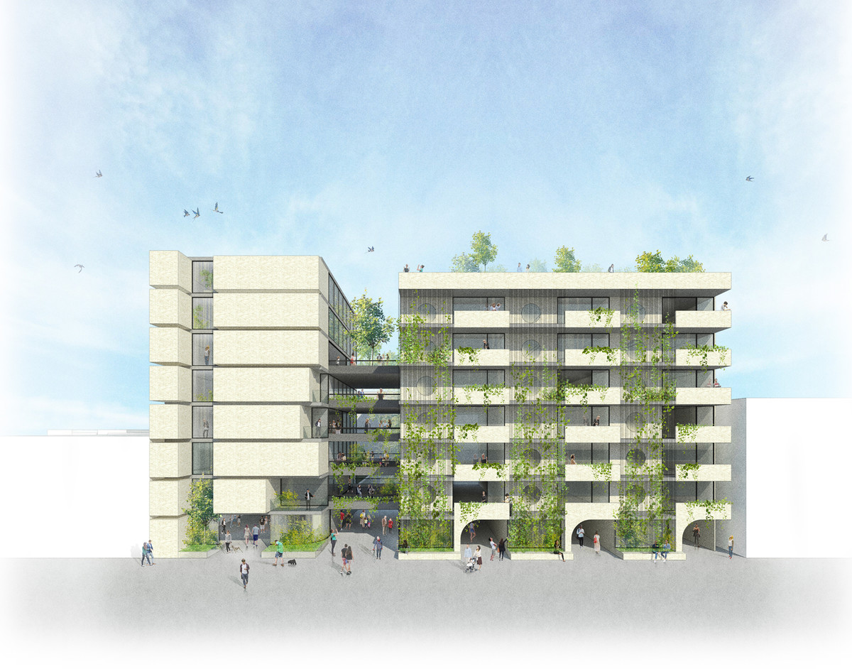 Two of the three towers contain high quality, affordable apartments, while the third tower houses a childcare centre, a theatre, art gallery, bookshop, cafes, makerspaces and co-working spaces.