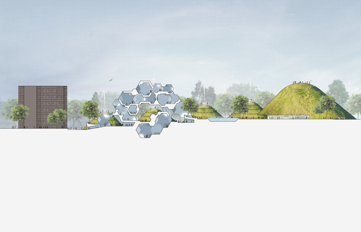 Then there are the bigger hills – the performing arts centre and the community hub. These speak the language of earth and everyone on it. One green and tranquil, the other exposing its geology.