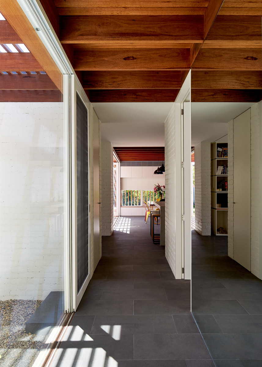 A simple, robust material palate of sustainably sourced timbers, stone and recycled brick weaves its way throughout, visually connecting the indoor and outdoor areas. Much like the house opens and closes to its surrounds, materials are revealed and concealed, betraying the structural and spatial logic of the renovations.