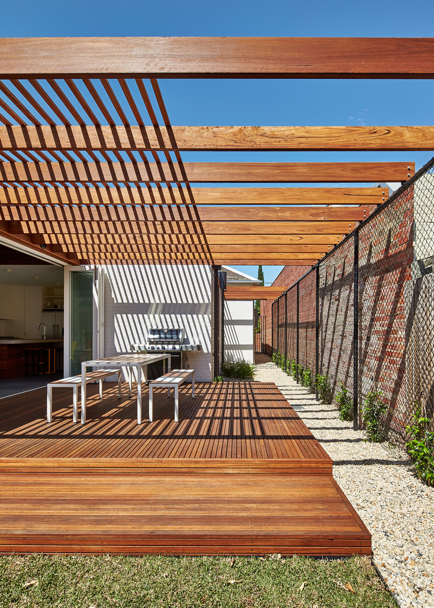 timber screens temper light and shade, then stop short, opening up to sky and garden.