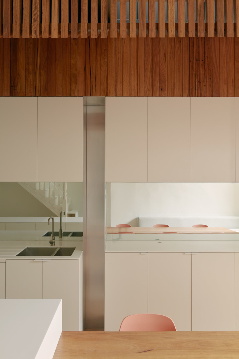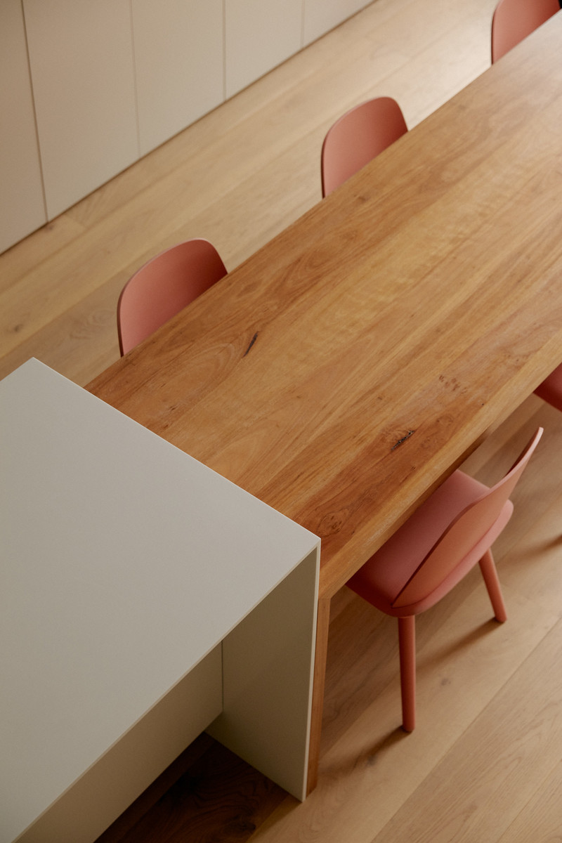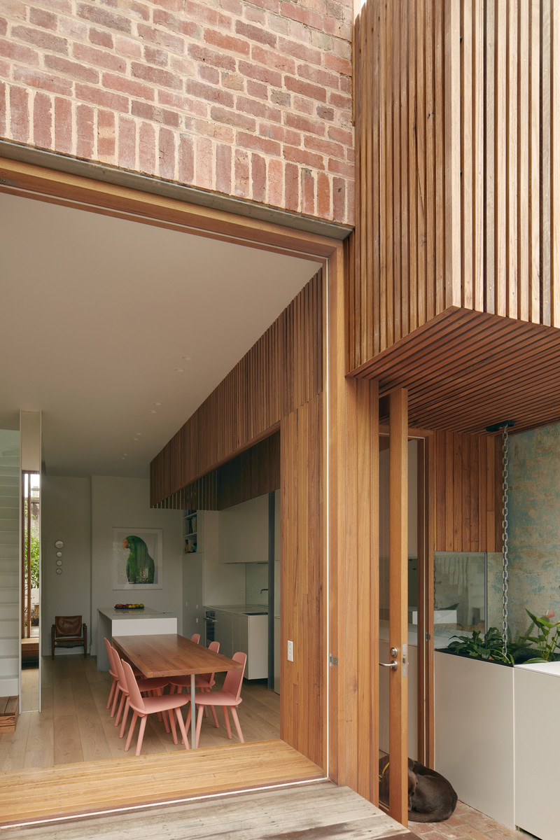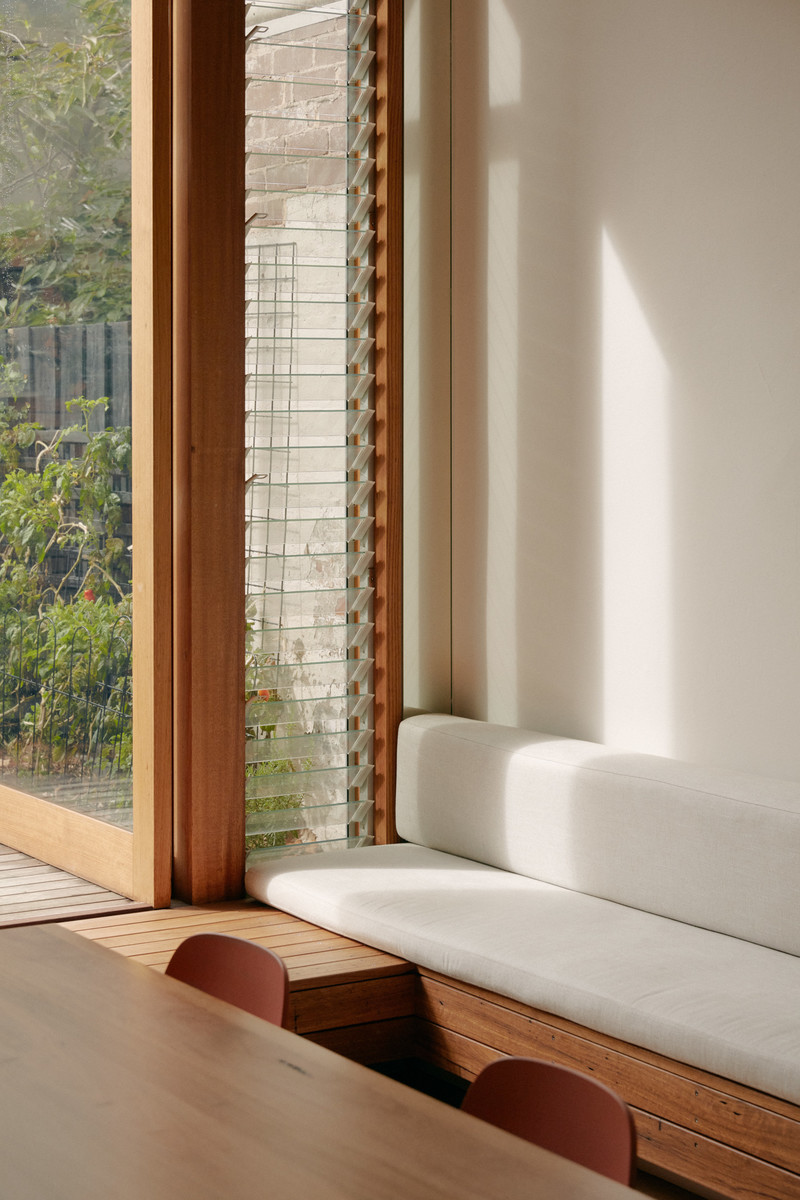 To unlock the potential of a narrow site, it’s all the about the edges and the interfaces. Built-in joinery is the master key. Upholstered banquettes, window seating and kitchen benches line the living space, freeing-up the centre for a generous island bench and built-in table. Everything feels integrated – is integrated – fitting together like a three-dimensional jigsaw.