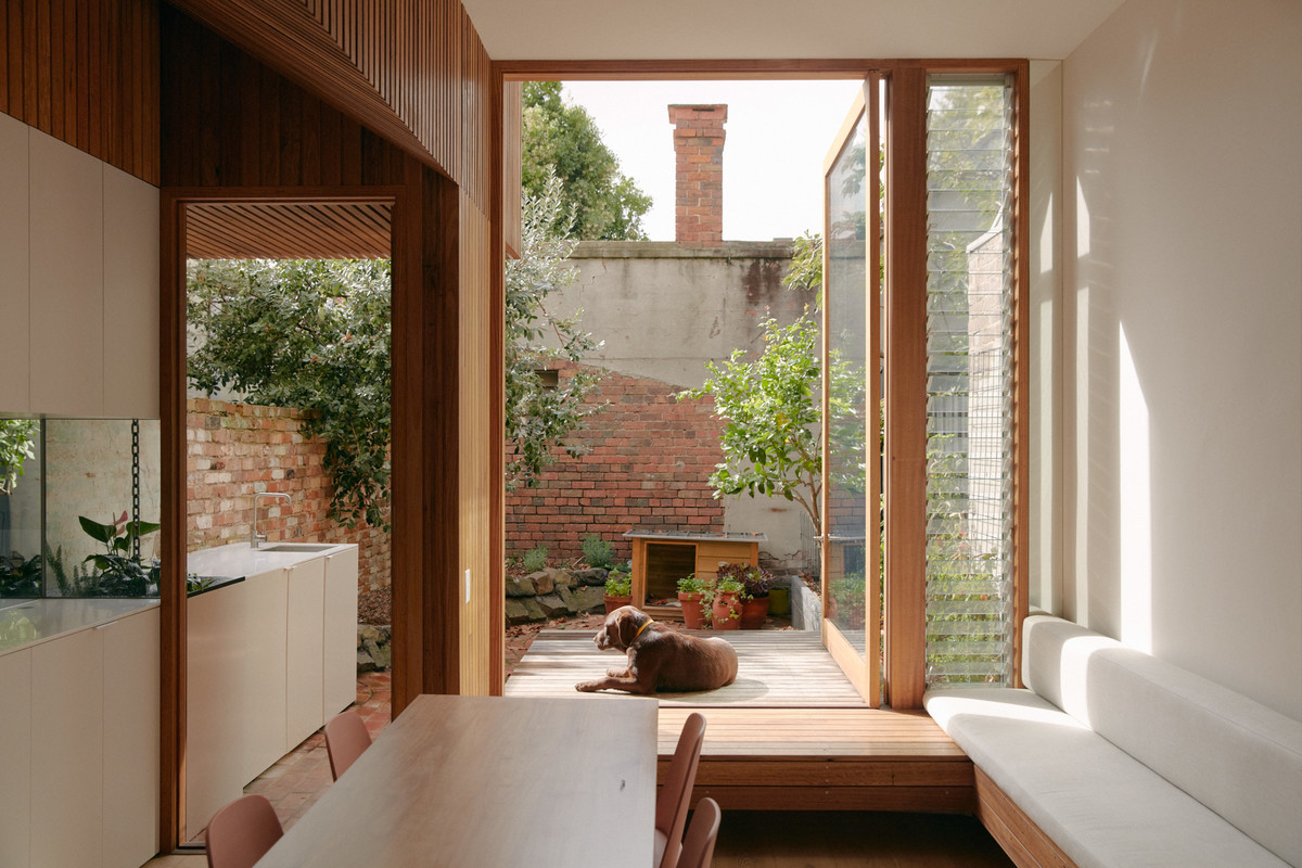 Deep thresholds establish a tidal zone of indoor and outdoor activity: the kitchen bench extends into the yard for outdoor cooking and food preparation; a timbered awning draws back into the house, filtering light from a skylight above; an indoor seat is a coffee table is an outdoor platform for perching and sunbathing. The indoors and outdoors wash through one another; a shared abundance.