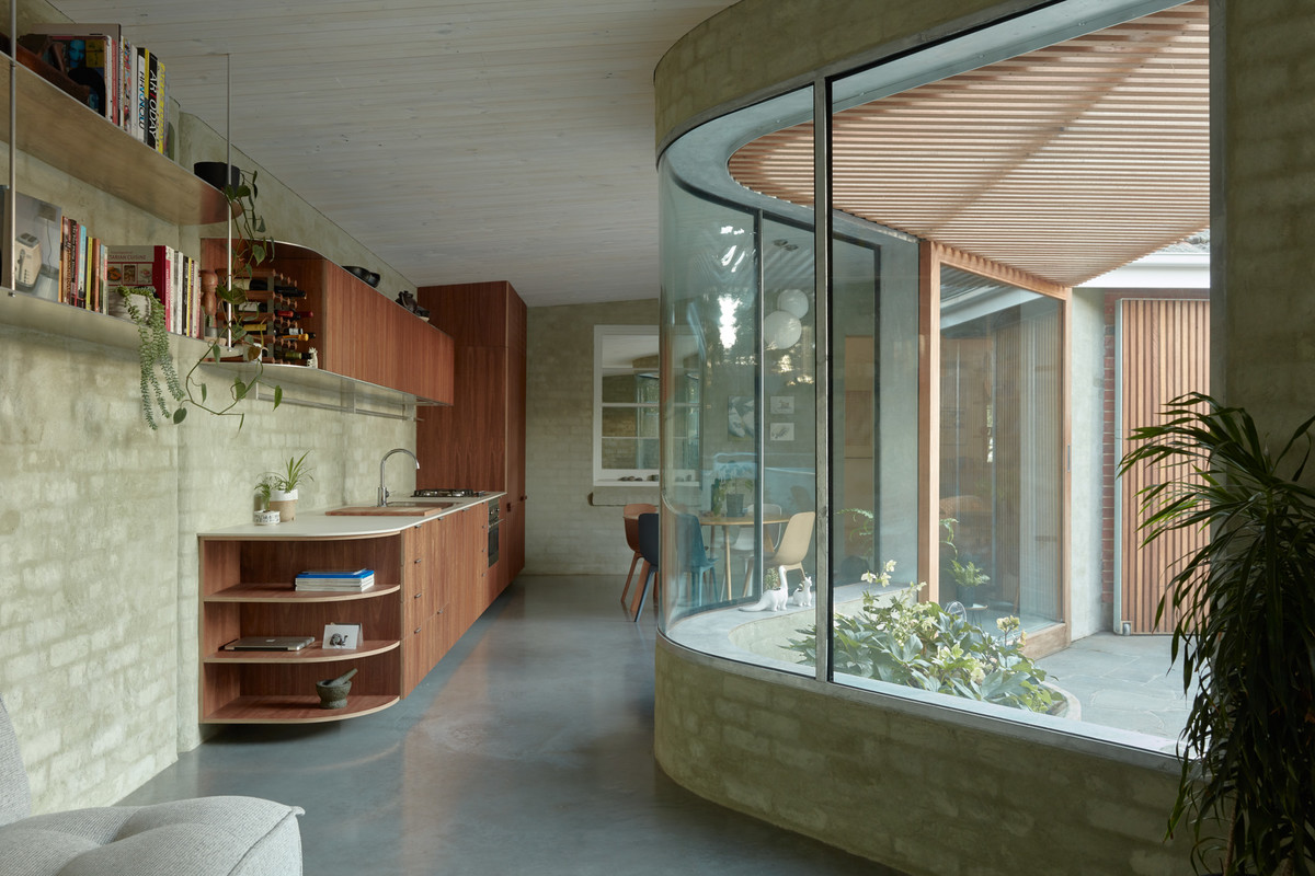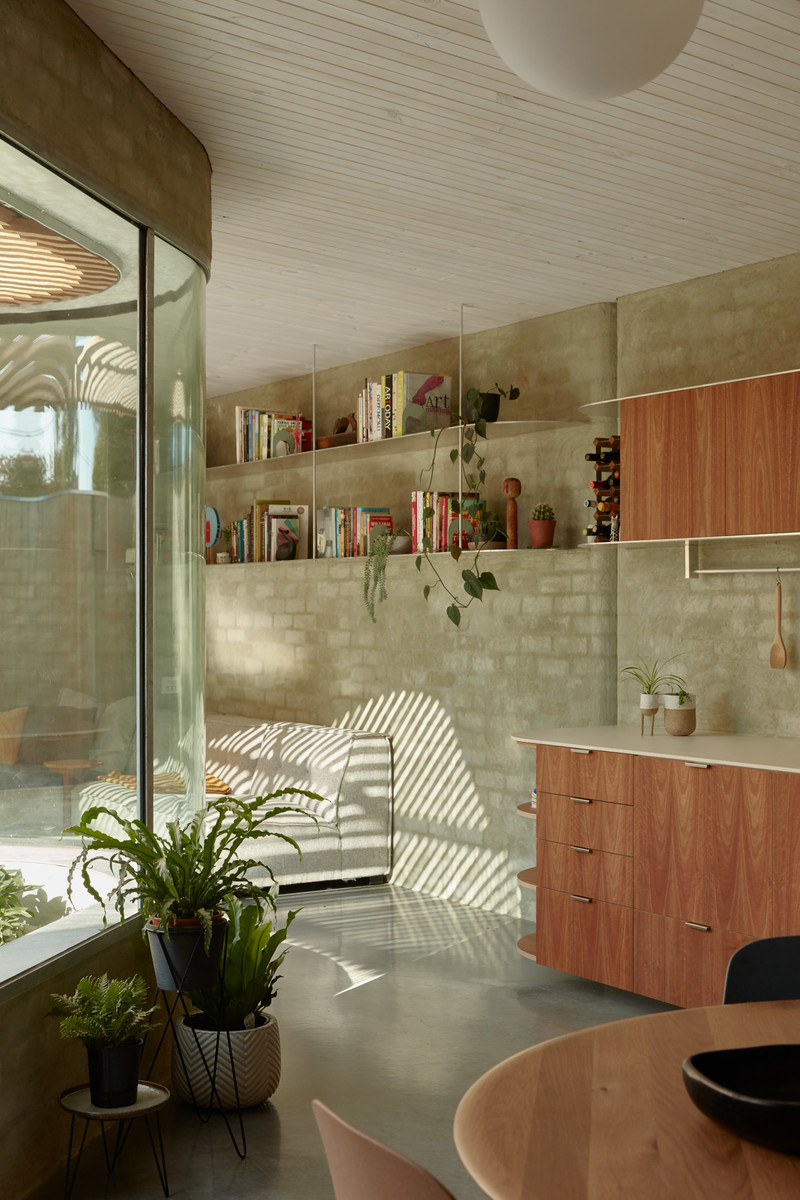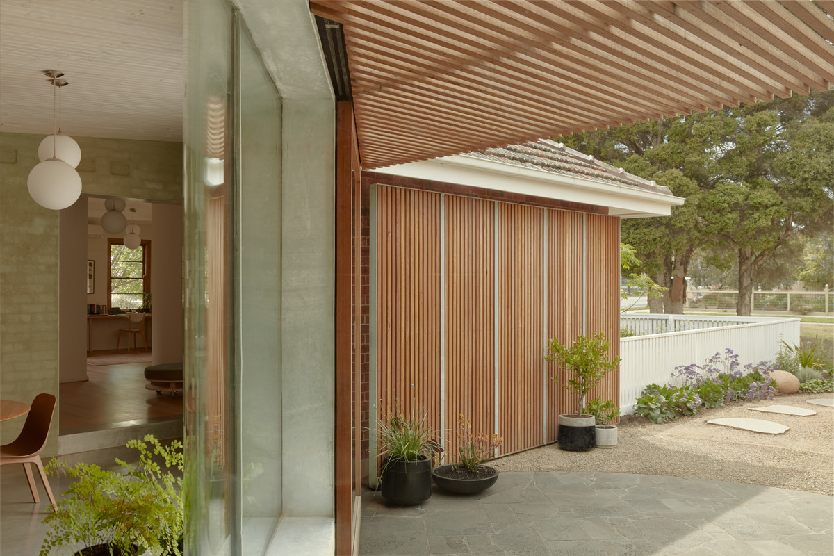 A moon of stone paving and a deep timber awning press into the side of the house, bending its glass wall inwards. Dappled shade, pale green bagging and the play of refracted light lend the threshold an aquatic atmosphere that carries into the house.