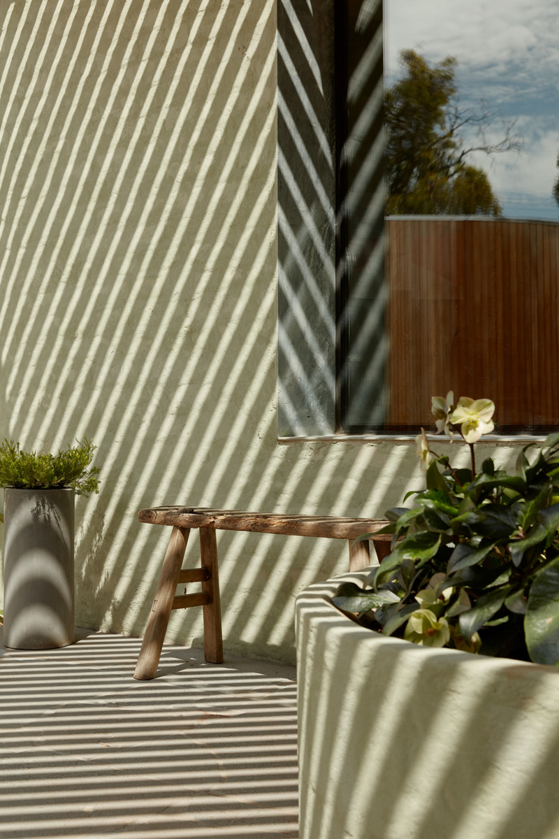 If the gate is open, visitors – having glimpsed inside – may enter a somewhat private, somewhat inviting garden courtyard. Here, the studio provides protection from the street; greenery softens the edges; tall battened fencing conceals all but the neighbour’s terracotta rooftop.