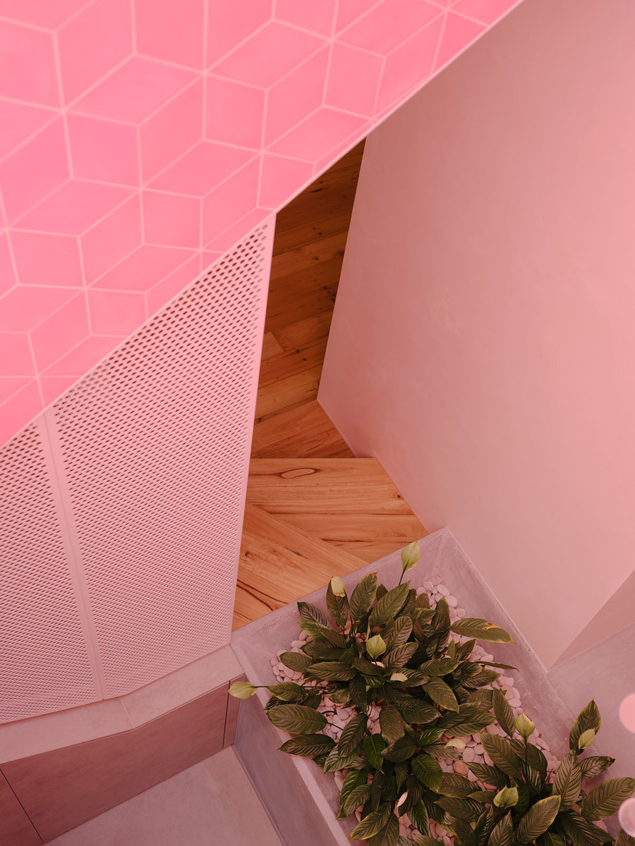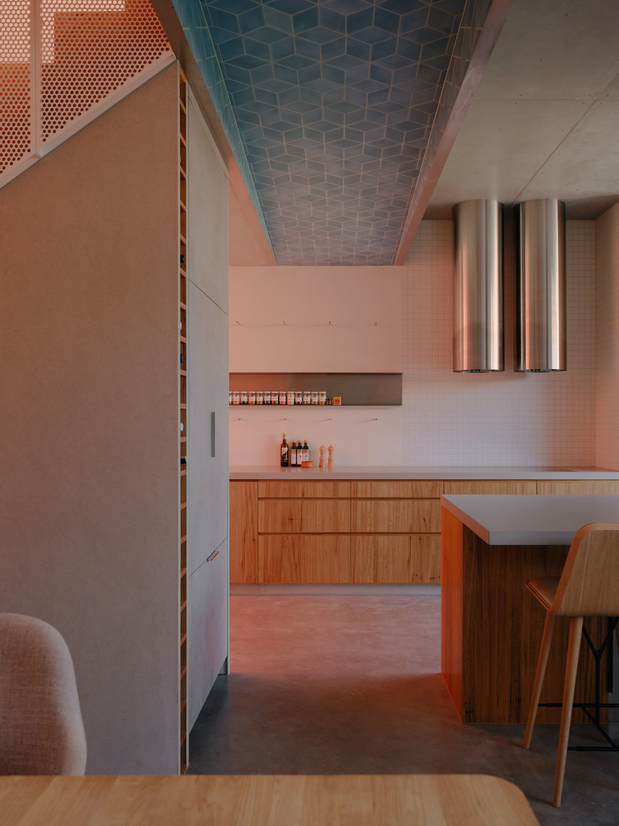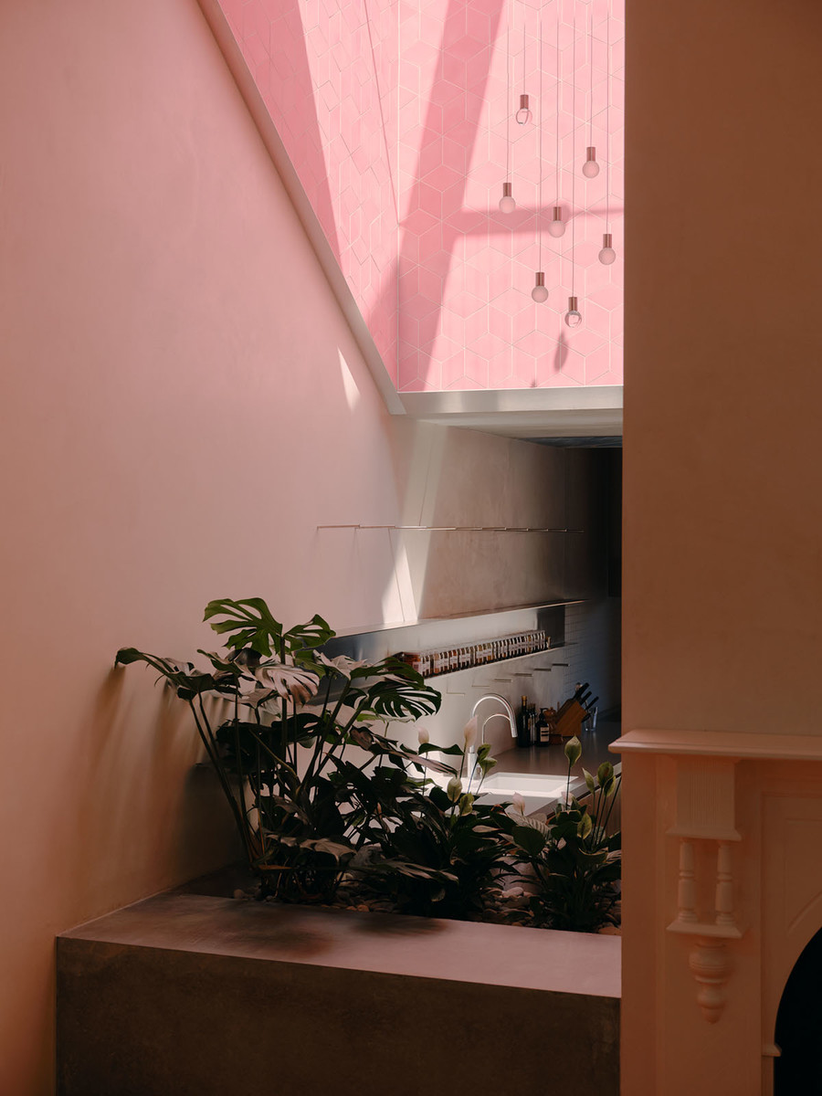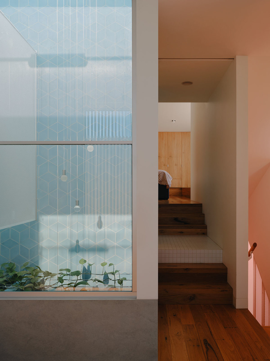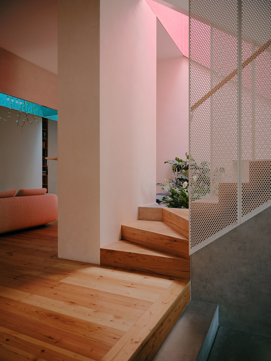 Sandwiched between two terraces, Skygarden is punctuated by three pigmented light shafts lined in tessellated tiles, drawing sunlight and colour deep into its chambers. In the course of a day, each of the shafts passes through phases of luminance and shadow, bathing the house in an ever-changing wash of mixed hues.