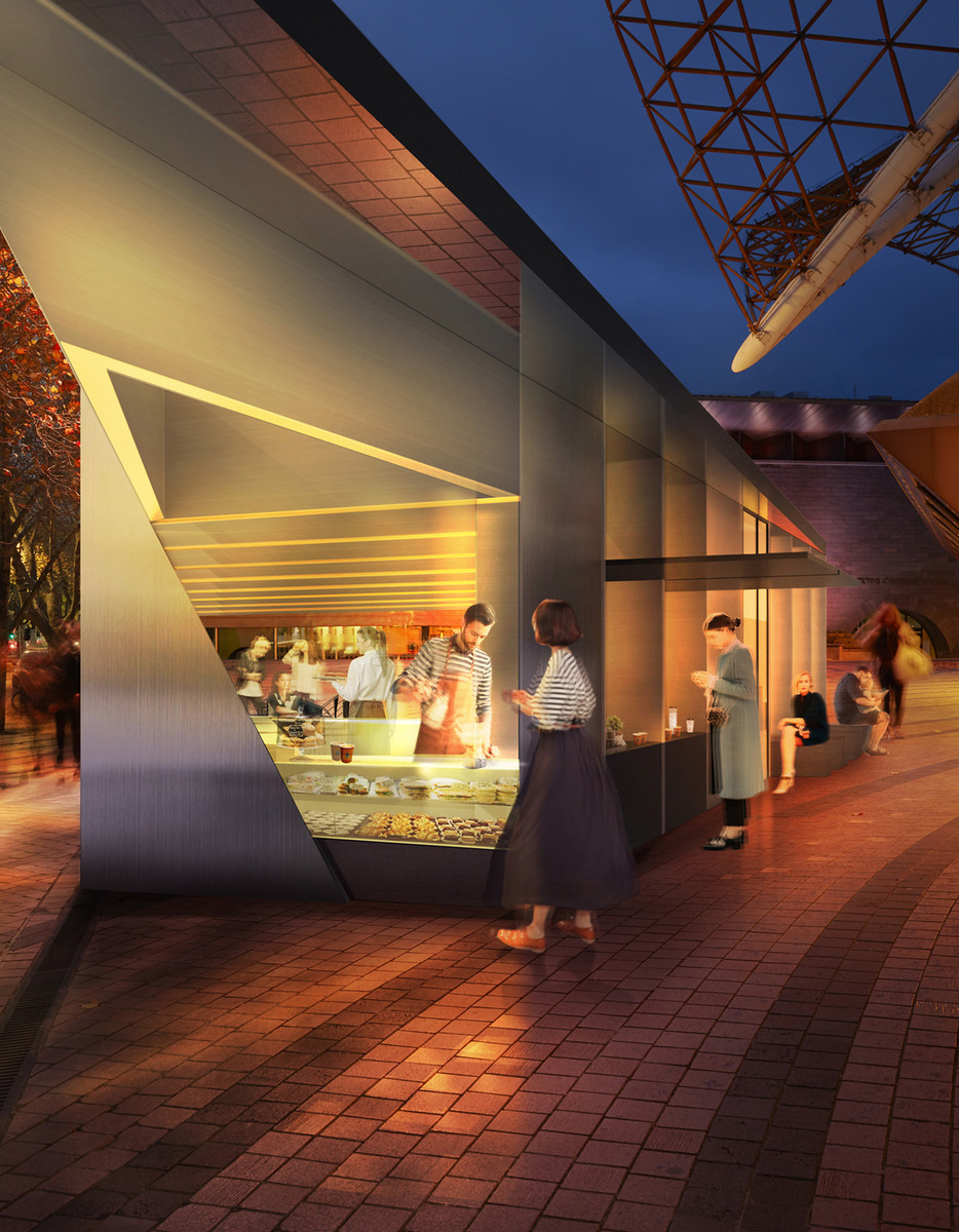 The new Arts Centre café assumes stage left; giving centre stage to the grand theatres entrance and the chorus of urban life. It is generous and welcoming, with an open stance to the forecourt and the tide of theatre patrons.