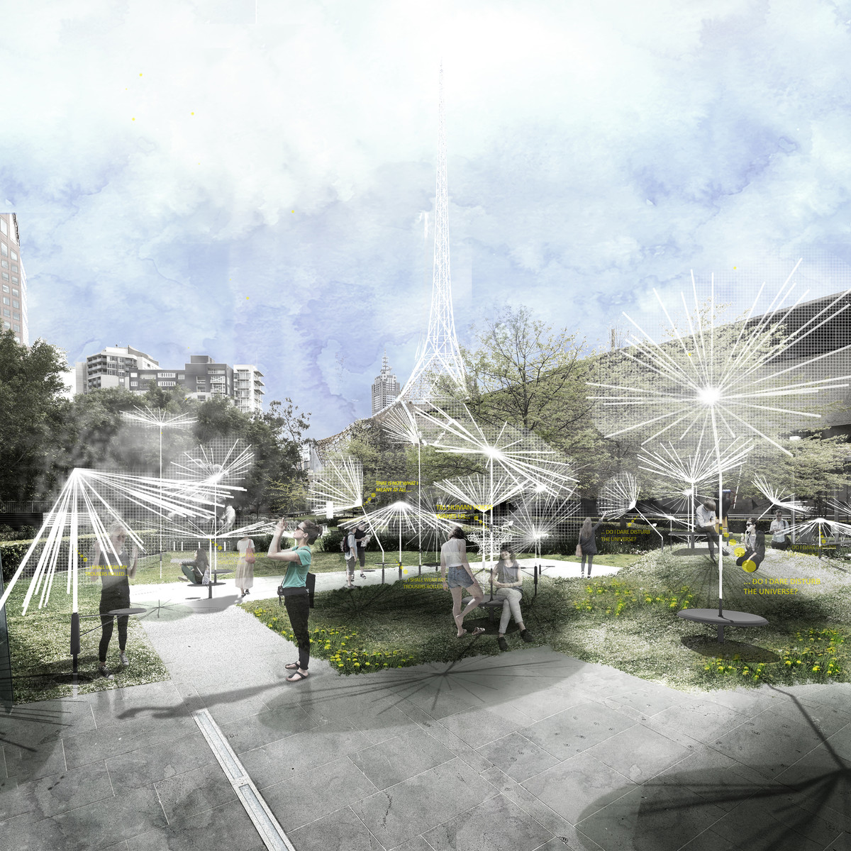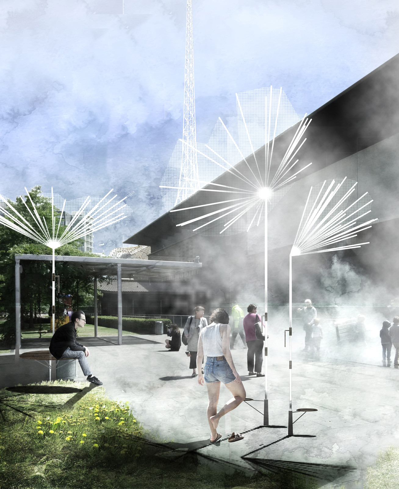 Our proposal is comprised of a field of Seeds, each providing opportunities for play, shade, connection and retreat. The Seeds themselves resemble those of a dandelion, a scattering of light twirling helicopters caught in suspended animation over the landscape.
