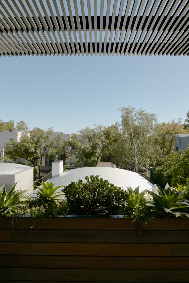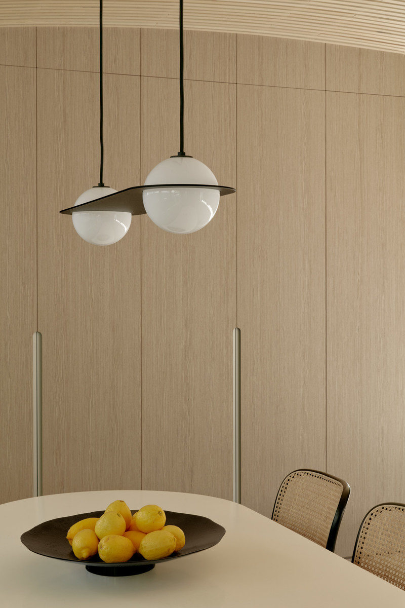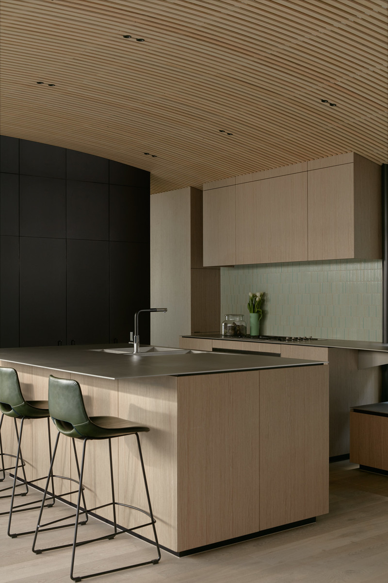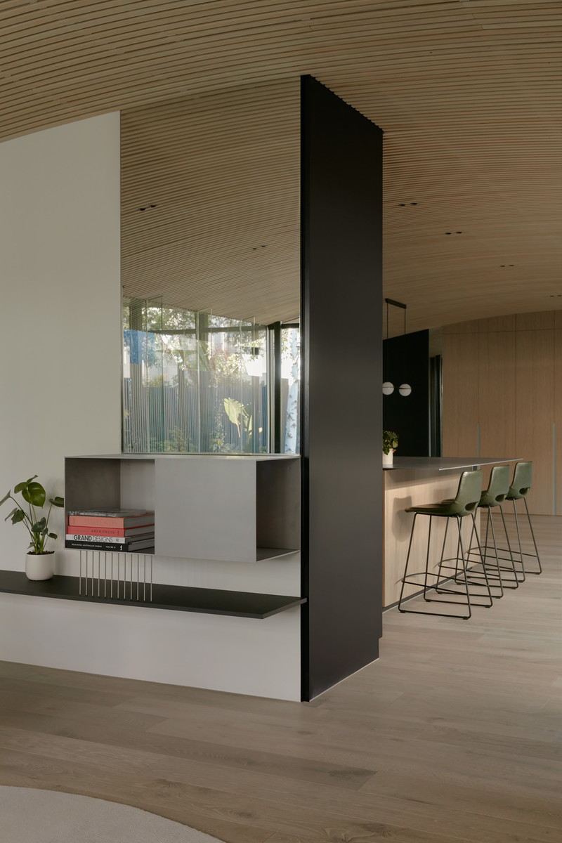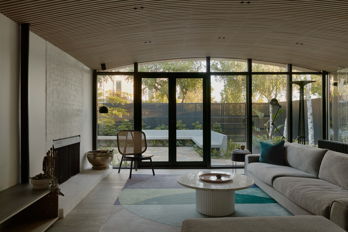 Working collaboratively with the builders at Sinjen Group, Architecture architecture have retained and celebrated these existing features. The living spaces have been remodelled to expose more of the curved glass, bringing them into immediate contact with the courtyard. The original curved ceiling has also been retained and is now lined with timber battens to accentuate this unique feature.