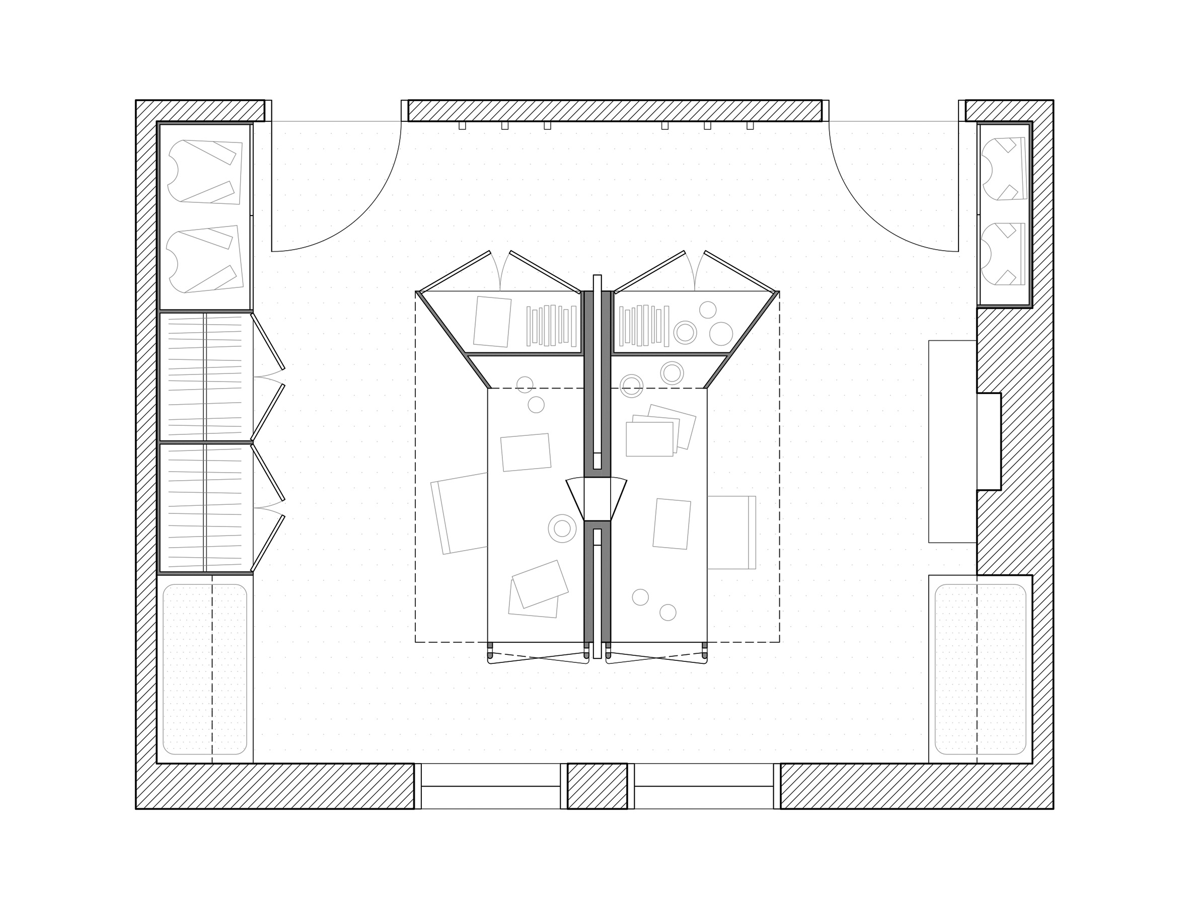 Of course twins have differences too. One is more ordered, the other more chaotic. Where one has chosen fish for wallpaper, the other has a jungle theme. Naturally there are moments when such differences warrant time apart: two doors slide out, and the bedroom is divided. Should a treaty require negotiation or a whisper shared, desks and beds are equipped with porthole hatches, able to be spun open or quickly shut again.