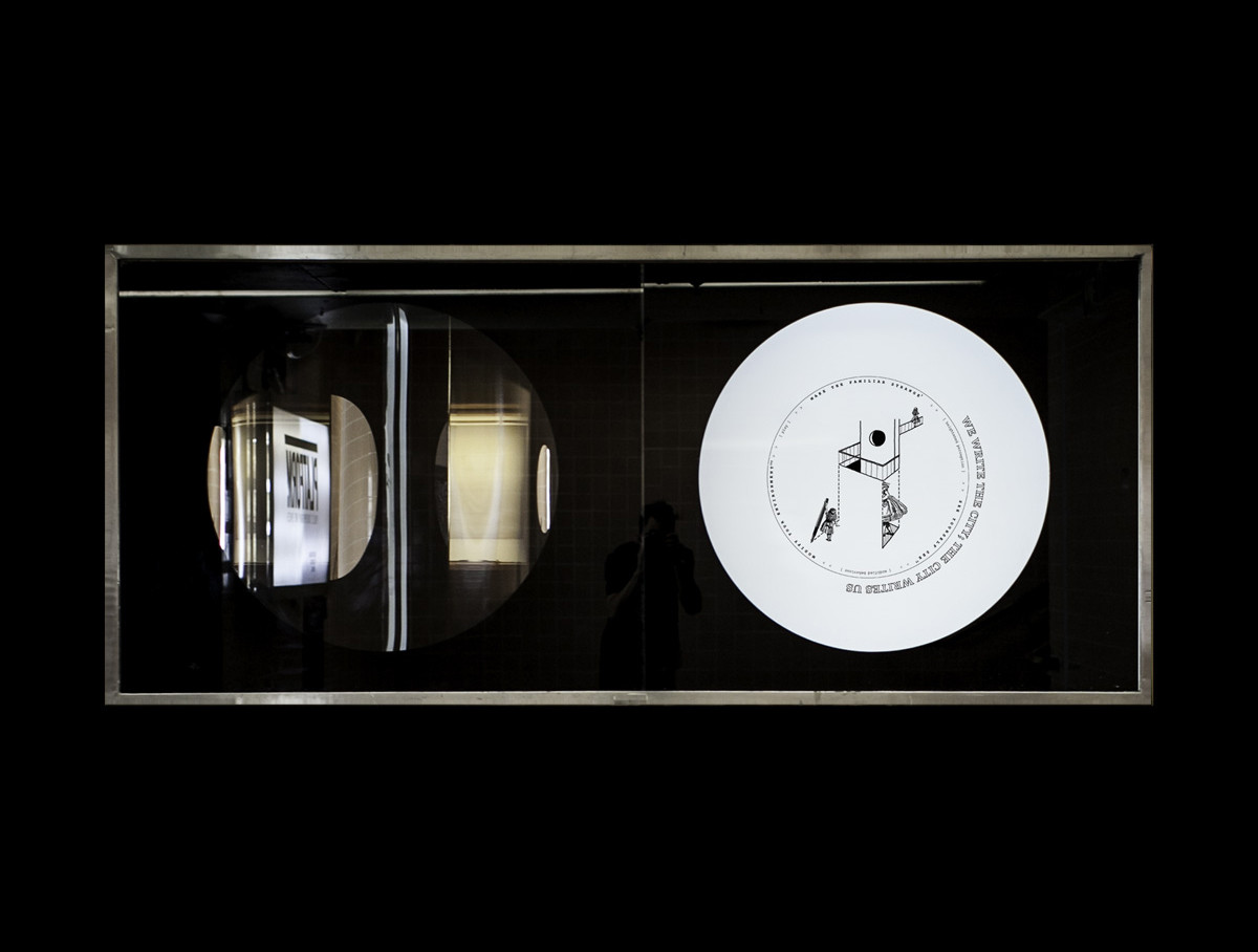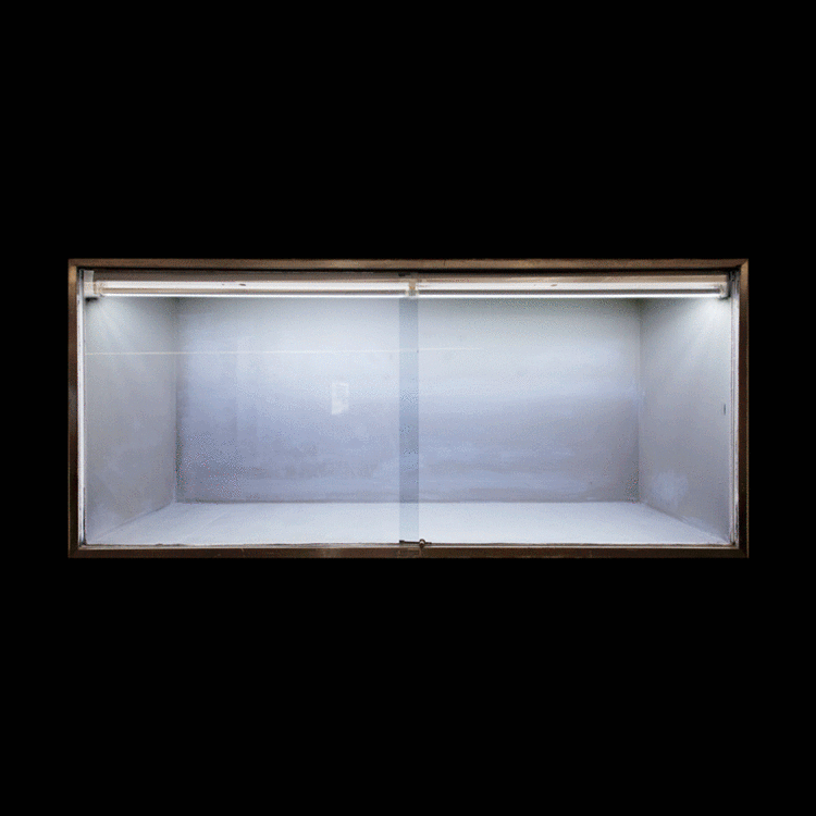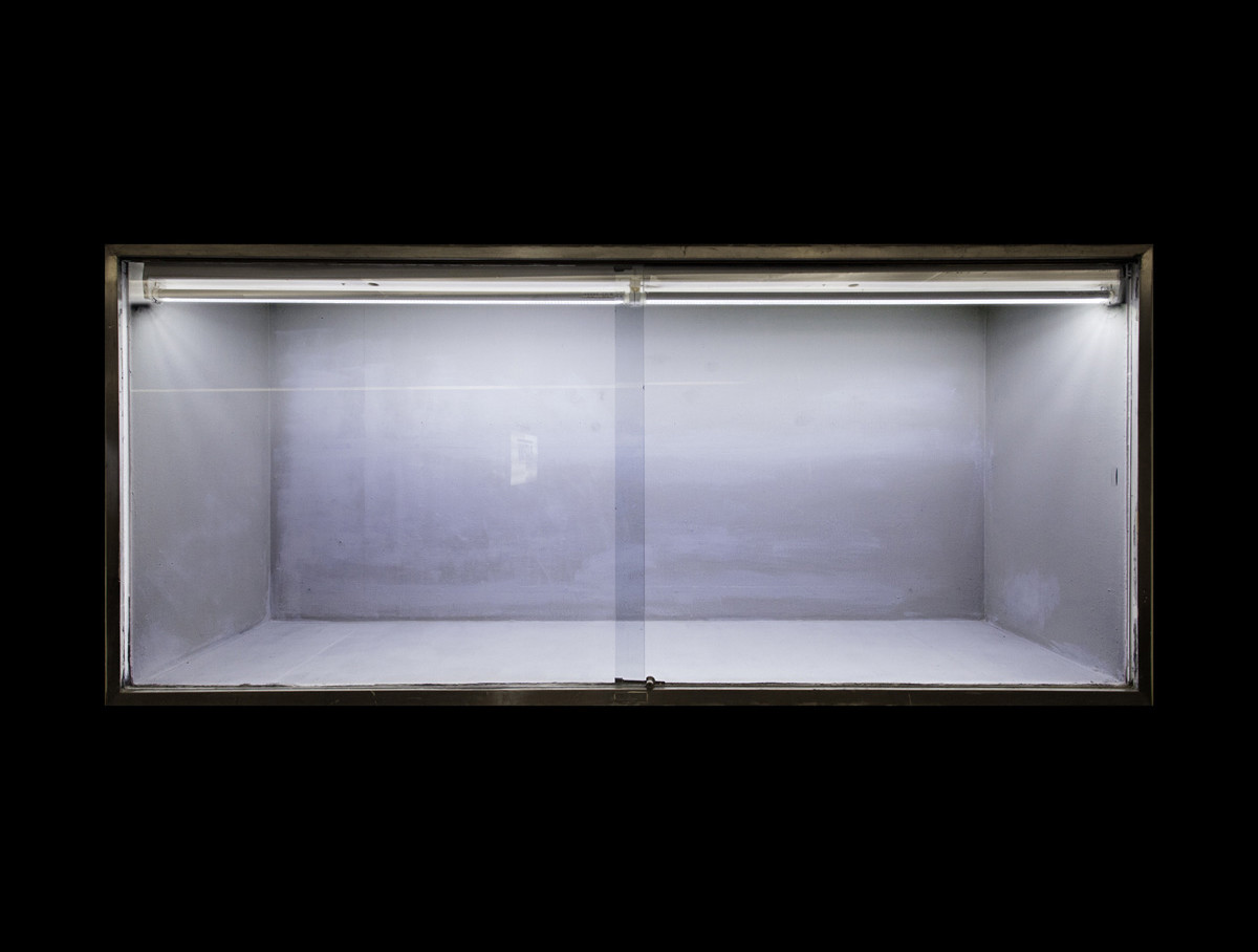 A white, empty display cabinet contains a virtual reproduction of the same white, empty display cabinet just out of reach see plan drawing. An alternate reality so close to our own, beyond the looking glass.